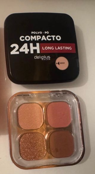 Lote de dos productos de maquillaje de la marca Deliplus. - Un polvo compacto 24H Long Lasting. - Una paleta de sombras con cuatro tonos (dorado, rosado, marrón brillante y marrón mate).