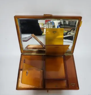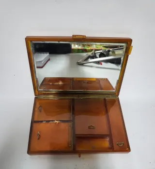 Elegante estuche de maquillaje vintage con un diseño clásico. - Material de baquelita. - Compartimentos interiores. - Espejo integrado.