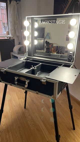 Camerino de maquillaje portátil con espejo y luces. - Diseño plegable y fácil de transportar. - Espejo integrado con iluminación. - Compartimentos interiores para organizar tus productos. 63x49x24 cm