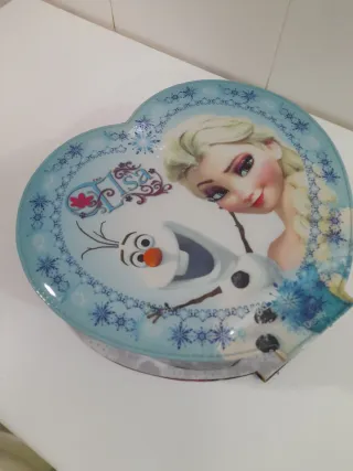 Estuche con forma de corazón de Frozen, con los personajes de Elsa y Olaf. - Diseño con temática de Disney. - Decorado con copos de nieve y detalles en rosa y azul. Esta en perfecto estado, tiene apartados dentro que se pueden rellenar de maquillaje. Hago envíos por España. Si necesitas más datos o fotos, estaré encantado de ayudarte. Precio negociable.