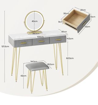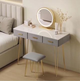 Elegante tocador con espejo circular y luz LED integrada. Perfecto para tu espacio de belleza. NUEVO CERRADO EN SU CAJA DE FABRICA (se vende porque se compro por error) - Diseño moderno con patas doradas. - Acabado superior blanco brillante. - Cajones con tiradores dorados. - Incluye un taburete tapizado a juego -3 cajones -Distintos tipos de luces