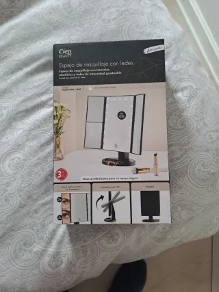 Espejo de maquillaje Cien Beauty con luces LED y control táctil sin usar nunca, ni siquiera sacado del embalaje. - Espejo con laterales abatibles. - Luz LED de intensidad graduable con 21 LEDs. - Incluye 4 pilas AAA/LR03. - Zoom de 2 posiciones: 2x y 5x. - Base antideslizante para un apoyo seguro. - Inclinable hasta 70°. - Plegable.