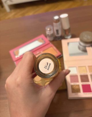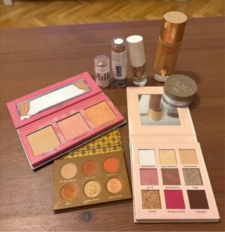 Pack de maquillaje con productos de Charlotte Tilbury y Zoeva, benefit, sephora, milk, nam - Bronceador en stick mate. - Paleta de sombras de ojos.