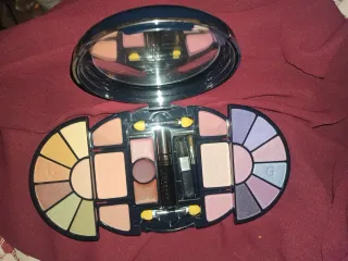 Set de maquillaje completo presentado en un elegante maletín rígido de color negro acompañado de elegante funda de terciopelo para su cuidado y protección. ¿Qué incluye? *Paleta extensa con más de 30 sombras de ojos en acabados mate y satinado (tonos tierra, nudes, azules, verdes y rosados). *3 tonos de colorete (blush) y polvos compactos para definir y dar color a las mejillas. *4 barras de labios (lipsticks) en tonos clásicos (rojos, rosas y nudes) coordinados con el resto de la paleta. Brocha para polvos/colorete. Pinceles aplicadores de esponja para sombras Lápices delineadores de ojos y labios. Espejo integrado en la tapa.