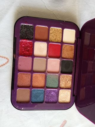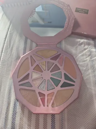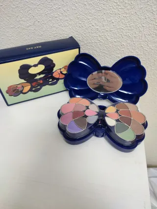 Estuche de maquillaje con un diseño original en forma de lazo. Contiene una variedad de sombras y coloretes. - El estuche incluye con espejo. - Tres plantas. Atención --> Por defecto de fábrica falta una pieza, se ve en la foto. Lo demás está completamente nuevo.