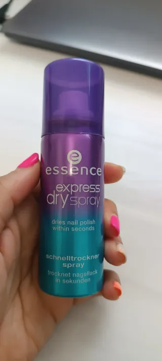 Spray de secado rápido para esmalte de uñas de la marca Essence. Lo vendo porque no lo he usado nunca ya que yo me hago las uñas semipermanentes. - Seca el esmalte en segundos. - Formato spray. - Envase morado y turquesa.