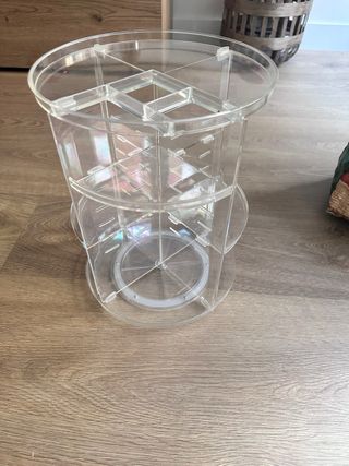 Organizador de acrílico transparente para maquillaje y cuidado de la piel. Cuenta con múltiples compartimentos y es giratorio para un fácil acceso. - Material: Acrílico transparente - Diseño giratorio 360° - Múltiples niveles y compartimentos