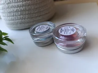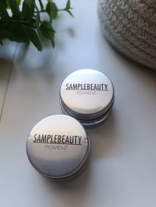 Dos pigmentos sueltos de la marca Sample Beauty con acabado duocromo, uno más azul verdoso y otro más rosa azulado. La última imagen es un swatch que encontré en internet del candycane. - Envase metálico con tapa de rosca. - Etiqueta con el nombre de la marca y el tipo de producto.