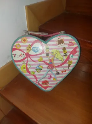 Precioso cofre con forma de corazón, ideal para guardar maquillaje o pequeños tesoros. Completo con todo lo que ves: Brillos labios. Maquillaje sobra de ojos, barras de labios, perfiladores, pintauñas, brochas aplicadoras... Regalo ideal para niñas coquetas. - Diseño con rayas rosas y blancas. - Ilustraciones de dulces y pasteles. - Detalle de lazo rosa. - Asa plateada para transportar.