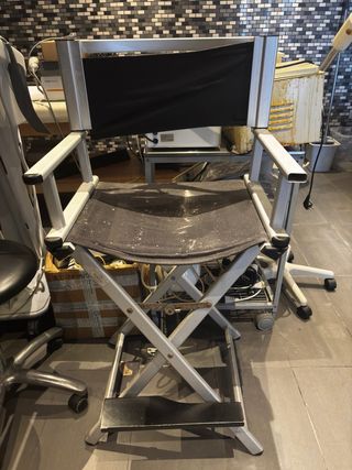 Silla de maquillaje profesional, ideal para maquilladores y estilistas. Su diseño plegable facilita su transporte y almacenamiento. - Estructura de aluminio resistente. - Asiento y respaldo de tela. - Reposapiés integrado.