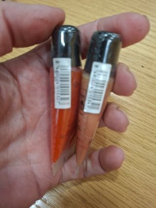 Dos brillos de labios nuevos y precintados. Colores: rojo- transparente y dorado- naranja- transparente - Tonos surtidos. - Envase individual.