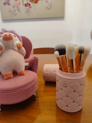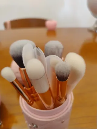 Set de brochas de maquillaje nuevas, listas para estrenar. Incluye una variedad de brochas para diferentes aplicaciones. - Estuche organizador en color turquesa. - Mangos de las brochas en color turquesa y negro. - Cerdas de las brochas en tonos blancos, azules y negros. - Faltan dos (las que me quedé)