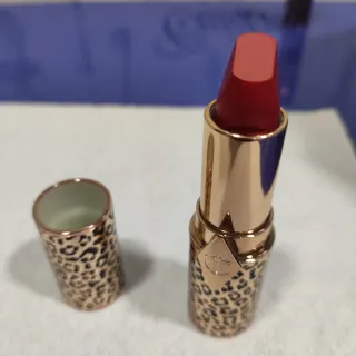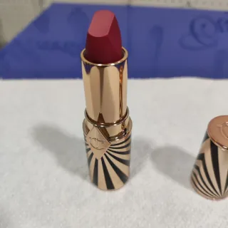 Labial de la marca Charlotte Tilbury con un acabado mate y un tono rojo vibrante. El diseño del envase es dorado con detalles en negro. - Diseño exclusivo con patrón de rayos. - Tapa dorada con el logo de la marca.