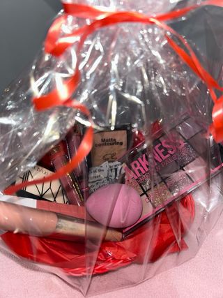 Preciosa cesta de regalo llena de productos de maquillaje. - Paleta de sombras de ojos. - Base de maquillaje. - Esponja de maquillaje. - Brillo de labios. CESTA PERSONALIZADA