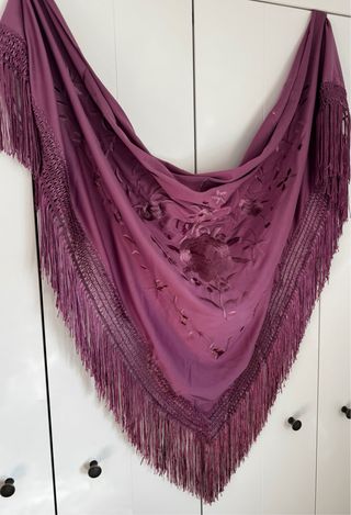 Elegante mantoncillo de flamenca en tono morado, perfecto para trajes de baile o como accesorio.1,5 por 0,65. Bordado y flecado a máquina. Poliéster. - Diseño con bordados florales. - Adornado con flecos largos y detalle de macramé en los bordes. - Tejido ligero y con buena caída.
