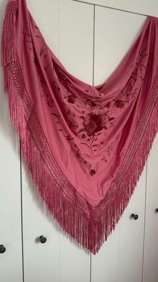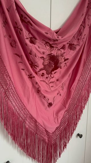 Mantoncillo de flamenca en color rosa, con un diseño floral y flecos. - Diseño floral. - Flecos largos. - Adorno de macramé en el borde.