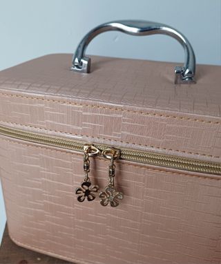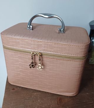 Práctico neceser tipo baúl, ideal para organizar tu maquillaje y accesorios. APENAS TIENE USO Medidas aprox 16 alto 23 ancho 15 fondo - Diseño texturizado. - Asa metálica plateada. - Cremallera dorada con dos colgantes de flor. - Acabado exterior en tono rosa pálido.