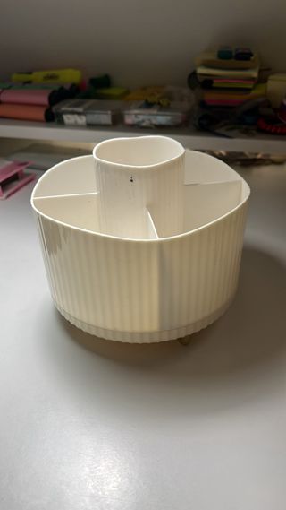 Organizador de maquillaje giratorio ideal para tener todos tus cosméticos ordenados en el tocador. Perfecto para pintalabios, lápices de ojos, máscaras de pestañas, brochas pequeñas y polvos. Está impreso en 3D con filamento negro con purpurina, lo que le da un acabado elegante con pequeños destellos. ✨ Ideal para tocador, baño o escritorio. ✨ Diseño moderno y muy práctico. ✔ Giratorio ✔ Varios compartimentos ✔ Impresión 3D ✔ Filamento negro con purpurina ✔ Ligero y resistente