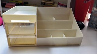 Práctico organizador de sobremesa con compartimentos y cajones para tus productos de belleza. - Diseño con múltiples divisiones. - Dos cajones transparentes. - Acabado en color beige.