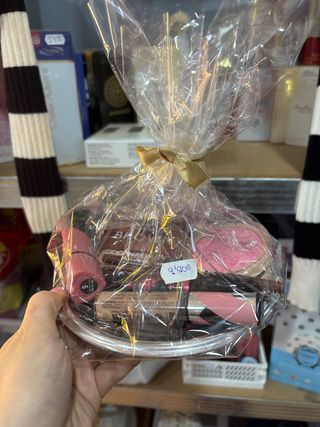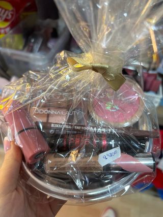 Preciosa cesta de regalo con varios artículos de maquillaje. - Incluye pintalabios, esmaltes y otros cosméticos. - Presentada en una bandeja plateada y envuelta en celofán con un lazo dorado. 7 PRODUCTOS DE MAQUILLAJE