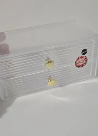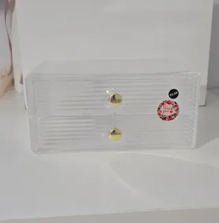 Práctico organizador de maquillaje con dos cajones. Su diseño transparente permite ver fácilmente el contenido. - Tiradores dorados. - Acabado acrílico.