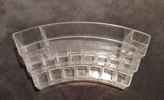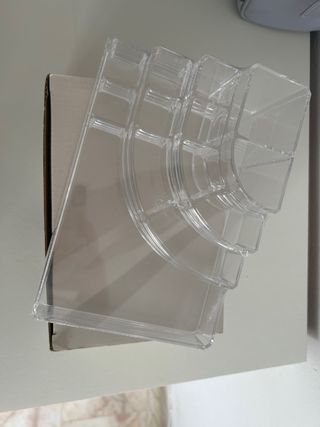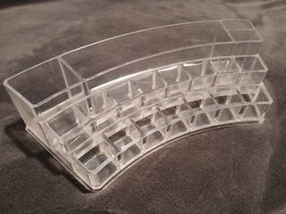 Práctico organizador de acrílico transparente para maquillaje. - Diseño curvo con múltiples compartimentos. - Ideal para labiales, brochas y otros cosméticos. - Material acrílico resistente. No hago envío.
