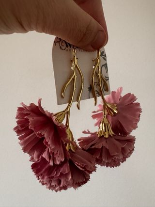 Pendientes largos con diseño de claveles. - Colgantes con forma de flor. - Detalle dorado en la rama y el centro de la flor. - Estilo llamativo y elegante.