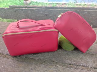 Maletín de maquillaje rosa, ideal para organizar tus cosméticos. Es ligero y fácil de transportar. - Perfecto para viajes o uso diario. - Tiene dos compartimentos con cremallera. - Asa de mano y correa para el hombro.
