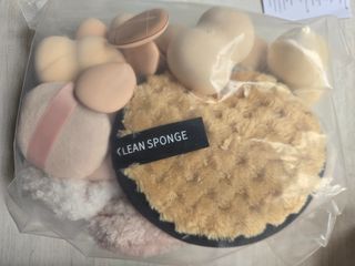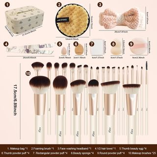 Este set incluye una variedad de herramientas para maquillaje, con mangos en tonos beige y detalles en rosa. - Bolsa de maquillaje *1 - Brocha espumosa *1 - Diadema para lavado facial *1 - Toalla de pelo 1/2 *1 - Huevo de belleza para pulgar *4 - Puffs de pulgar *4 - Puffs rectangulares *4 - Esponjas de belleza *4 - Puffs redondos *4 - Brochas de maquillaje *25