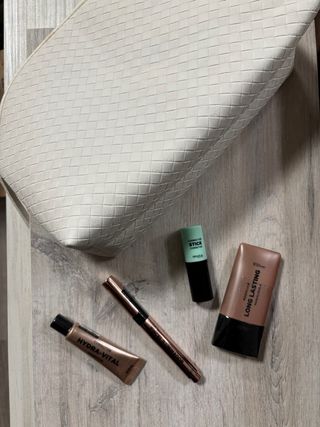 Lote compuesto por bolsa de maquillaje, Maquillaje Long Lasting, Corrector en crema, Corrector cubre imperfecciones color verde y Pincel Iluminador