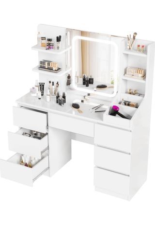 NUEVO EN SU CAJA SIN ABRIR Tocador moderno con espejo y luces integradas. - Diseño elegante en color blanco. - Amplio espejo. - Estantes para organizar tus productos. - Cajón espacioso. - Mueble auxiliar con cajones.