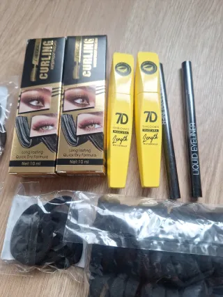 Lote variado de productos de belleza y accesorios para el cabello. - Dos cajas de máscara de pestañas Curling. - Dos tubos de máscara de pestañas 7D Length. - Un delineador líquido para ojos. - Un paquete de gomas de pelo multicolor. - Un paquete de gomas de pelo negras.