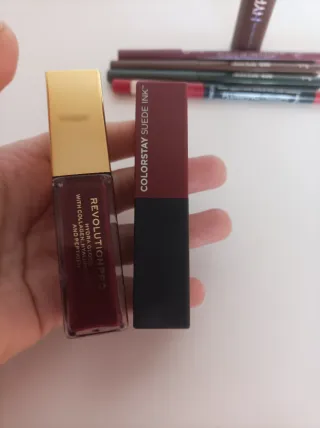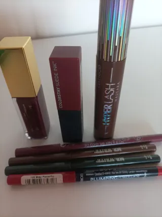 Incluye: Labial mate de Revlon fijo (tono vino) Gloss de Revolution con ácido hialurónico (tono vino) Dos perfiladores de ojos de la marca The balm (uno verde oscuro y otro marrón con destellos dorados) Perfilador rojo cereza de larga duración de Catrice Perfilador rosa intenso de Primark Mascara de pestañas marrón de catrice