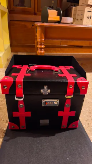 Elegante caja de maquillaje de la marca ABcollezioni. Presenta un diseño llamativo con detalles en contraste. - Diseño con correas rojas. - Asa superior para fácil transporte. - Cierre de seguridad con combinación.