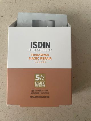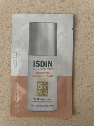 Protector solar ISDIN Fusion Water Magic Repair con color. Muestras de viaje fotoprotector ISDIN -Para el uso diario con triple acción: protege, repara y revierte Fórmula que protege la piel de la polución urbana Contribuye a la reparación del daño solar acumulado a nivel celular Contiene ácido hialurónico que mejora la elasticidad e hidratación de la piel No irrita los ojos #ISDIN #protecciónsolar #50 #fusionwatermagic
