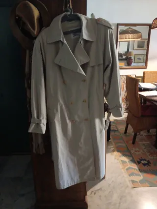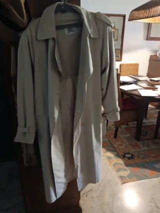 Gabardina clásica de la marca Burberrys. - Diseño atemporal. - Doble botonadura. - Cuello con solapas. - Hombreras. - Puños ajustables. La talla exacta no la se, mido 1'72 (delgado). Tiene dos pequeñas marchitas en la espalda, se ven en las fotos.