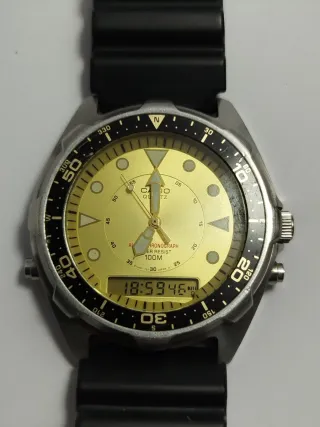 Reloj de pulsera con esfera dorada y detalles plateados. - Bisel giratorio con marcadores. - Correa de goma negra.