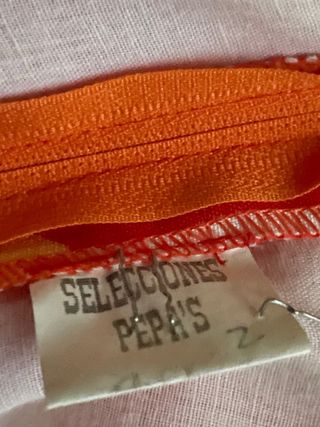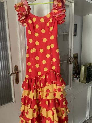 Vestido para feria con un diseño vibrante. - Cierre de cremallera. - Detalles en naranja y rojo.