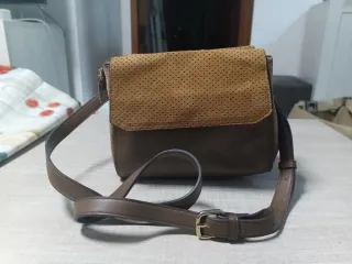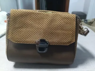 Bolso de mano con un diseño elegante y moderno. Cuenta con un cierre metálico frontal y una correa ajustable. - Acabado exterior con microperforaciones. - Combinación de texturas. - Cierre de solapa con broche.