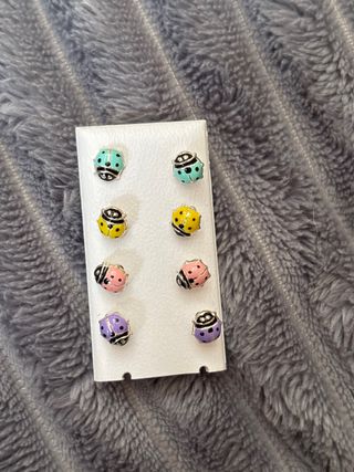 Conjunto de cuatro pares de pendientes de plata de ley con diseños de mariquitas. Sale a 3,50 el par - Diseños variados y coloridos. - Cierre seguro para un uso cómodo.