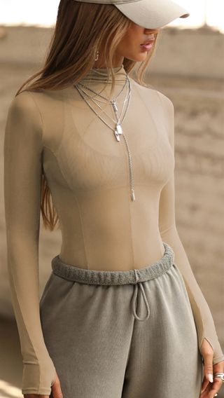 Jersey de manga larga con un diseño transparente y escote de cuello alto. Perfecto para un look atrevido y moderno. - Tejido ligero y elástico. - Acabado semitransparente. - Diseño ajustado.
