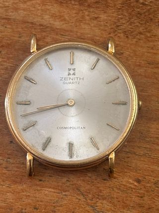 Elegante reloj Zenith Cosmopolitan con detalles dorados y esfera blanca. - Diseño clásico y refinado. - Caja y detalles en tono dorado. - Esfera de color blanco. - No funciona.