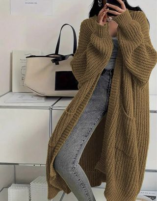 Cárdigan largo de punto grueso en color marrón. Tiene un diseño abierto y bolsillos. - Tejido de punto grueso. - Diseño largo. - Bolsillos frontales.