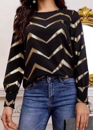 Elegante blusa de manga larga con un llamativo diseño. - Patrón de zigzag con detalles metálicos dorados. - Puños elásticos con fruncido. - Cuello redondo.