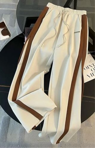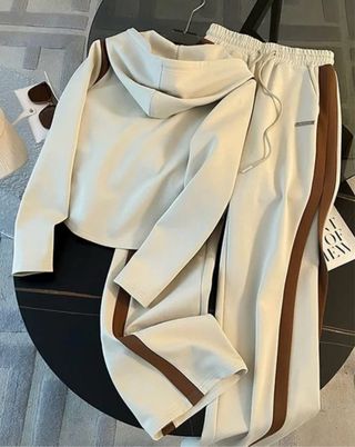 Conjunto de sudadera con capucha y pantalón a juego. - Diseño moderno con detalles en marrón. - Tejido cómodo y de calidad.