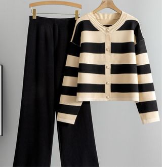 Conjunto de dos piezas de punto para mujer. - Cardigan a rayas con botones. - Pantalón ancho de talle alto.