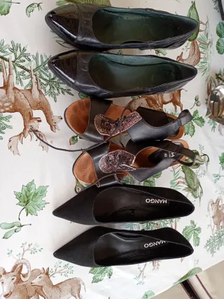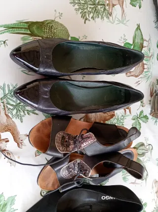 Elegantes zapatos de tacón y planos. - Zapatos de tacón negros con punta fina. - Zapatos planos negros con puntera brillante.dos de piel
