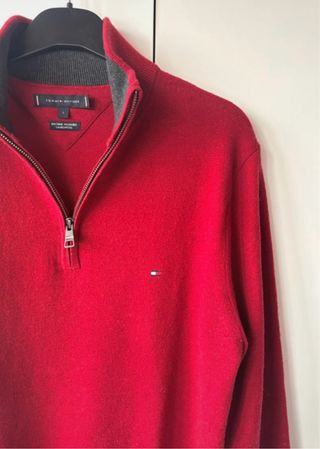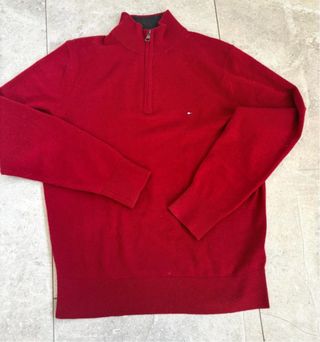 Jersey original Tommy Hilfiger de lana lambswool, color rojo, con media cremallera. Elegante. Talla L. Muy suave y cómodo Abriga sin ser pesado Clásico y fácil de combinar Tiene un pequeño descosido debajo de la sisa, que puesto no se ve Cuello con interior gris. Pequeño logo de la marca en el pecho. #tommyhilfiger #tommy #lamoswool #lana #lambswooljumper #jerseyhombre #corteingles