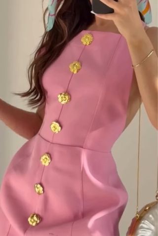 Vestido elegante de corte recto con detalles de botones. - Diseño de un solo hombro. - Botones dorados con forma de flor. - Tejido en tono rosa vibrante.