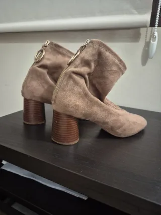 Botines de tacón con un diseño moderno y elegante. - Material exterior tipo ante. - Cierre de cremallera en la parte trasera. - Detalle de aro metálico en la cremallera. - Tacón grueso con acabado acanalado.
